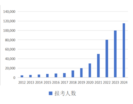 自2012年以来,人数逐年稳步上升,当前报考人数每年超过